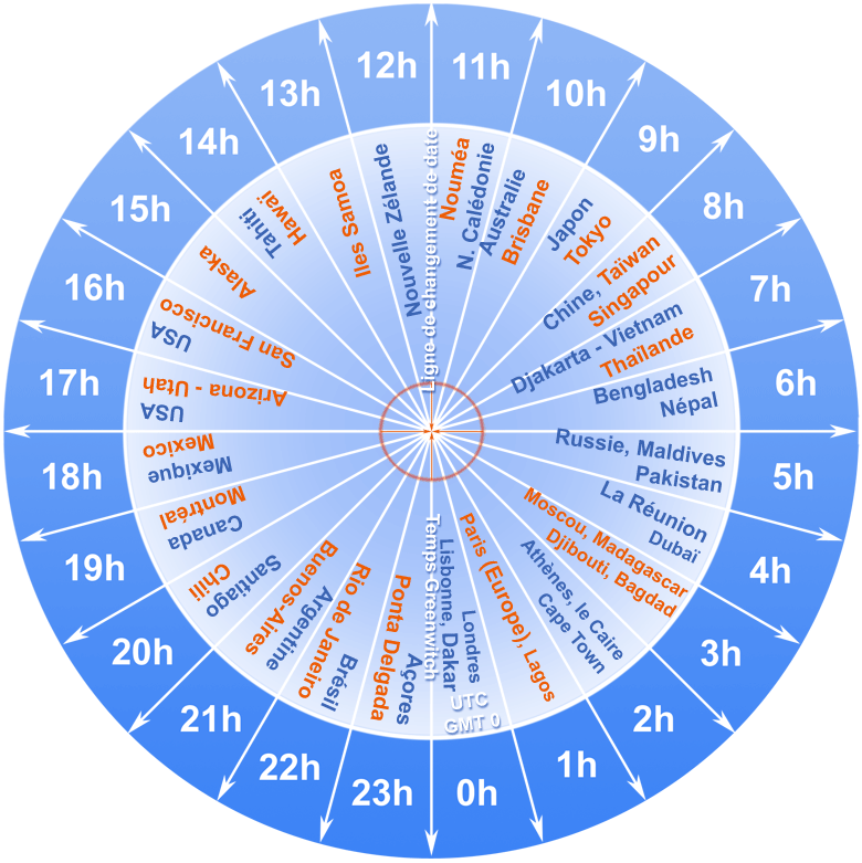 Pour plus de précision, se reporter à l'excellente carte de l'heure dans le monde (en anglais), malheureusement "pourrie" de publicités...